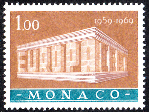In Monaco sind die Europamarken 1969 am 26. April 1969 mit dem Gemeinschaftsmotiv "„EUROPA“ und „CEPT“ in Tempelform" erschienen. Hier der Wert zu 1,00 Franc, der in einer Auflage von 509 580 Stück erschien.