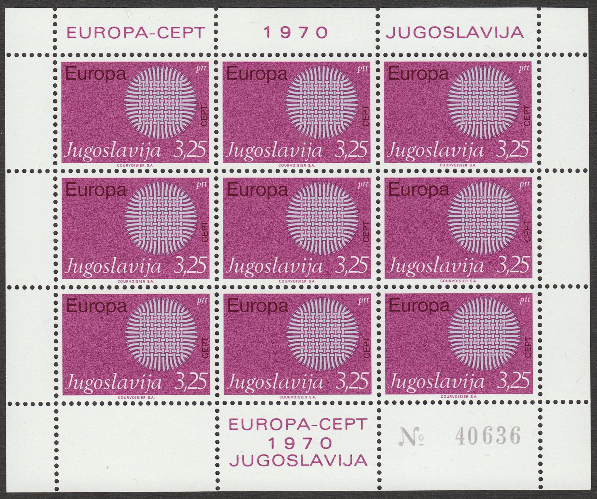 Die Europamarke 1970 aus Jugoslawien in der Wertstufe 3,25 Dinar im postfrischen Kleinbogen mit fünfstelliger Bogenzählnummer: