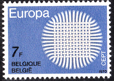 In Belgien erschienen die Europamarken 1970 am 1. Mai 1970. Hier die Marke zu 7 Francs mit dem Gemeinschaftsmotiv "Flechtwerk als Sonnensymbol", die in einer Auflage von 2 750 000 Stück erschien.