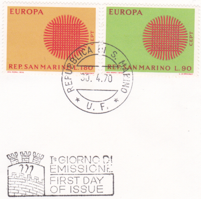 Briefstück mit den beiden Europamarken 1970 aus San Marino und dem Ersttagstempel aus San Marino.