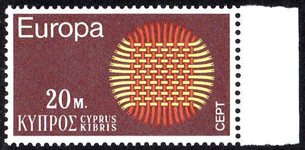 In Zypern erschienen die Europamarken 1970 am 4. Mai 1970. Hier eine Marke zu 20 Mills mit dem Gemeinschaftsmotiv "Flechtwerk als Sonnensymbol", die in einer Auflage von 648 163 Stück erschien.