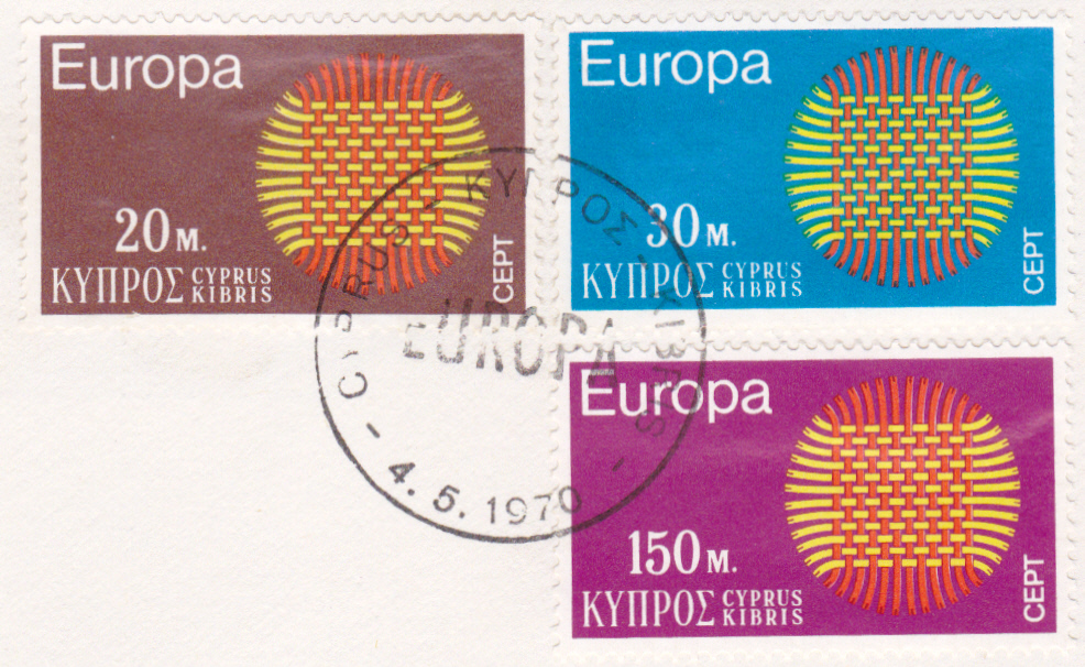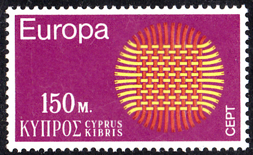 In Zypern erschienen die Europamarken 1970 am 4. Mai 1970. Hier eine Marke zu 150 Mills mit dem Gemeinschaftsmotiv "Flechtwerk als Sonnensymbol", die in einer Auflage von 410 505 Stück erschien.