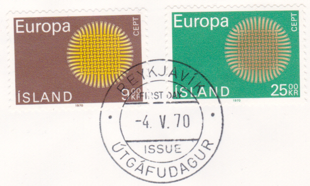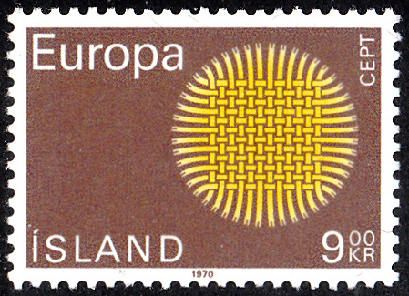 In Island erschienen die Europamarken 1970 am 4. Mai 1970. Hier die Marke zu 9,00 Kronen mit dem Gemeinschaftsmotiv "Flechtwerk als Sonnensymbol ", die in einer Auflage von 1 000 000 Stück erschien.