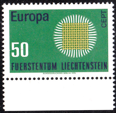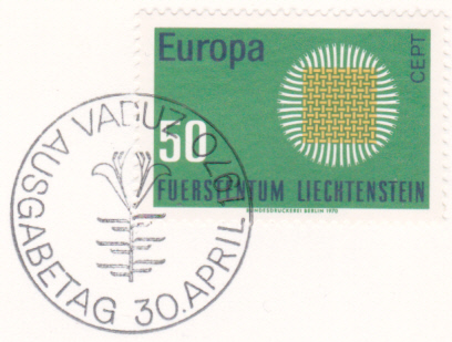 In Liechtenstein erschien eine Europamarke 1970 am 30 .April 1970. Hier die Marke zu 50 Rappen mit dem Gemeinschaftsmotiv "Flechtwerk als Sonnensymbol", die in einer Auflage von 2 014 742 Stück erschien.