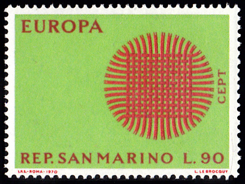 In San Marino erschienen die Europamarken 1970 am 30. April1970. Hier die Marke zu 90 Lire gelbgrün/rot mit dem Gemeinschaftsmotiv "Flechtwerk als Sonnensymbol".