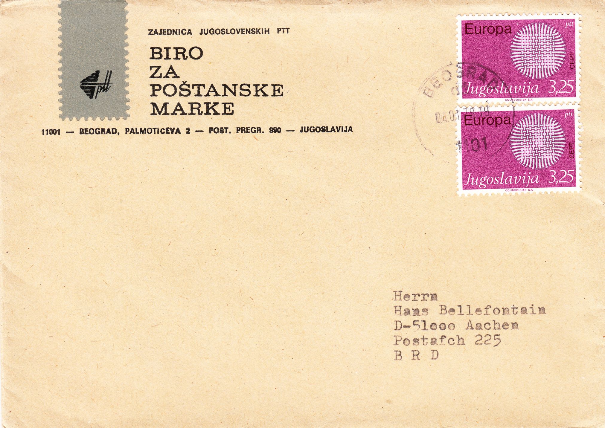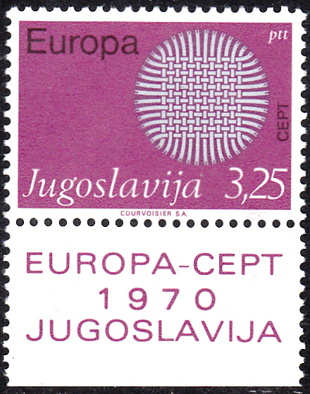 In Jugoslawien erschienen die Europamarken 1970 am 4. Mai 1970. Hier ein Unterrandstück der Marke zu 3,25 Dinar mit dem Gemeinschaftsmotiv "Flechtwerk als Sonnensymbol", die in einer Auflage von 876 324 Stück erschien.