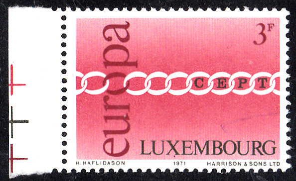 In Luxemburg erschienen die Europamarken 1971 am 3. Mai 1971. Hier die Marke zu 3 Fr mit dem Gemeinschaftsmotiv "Brüderlichkeit und Zusammenarbeit durch Kette symbolisiert ", die in einer Auflage von 1 000 000 Stück erschien. Auf dem Bogenrand sind drei Passerkreuze zu erkennen.