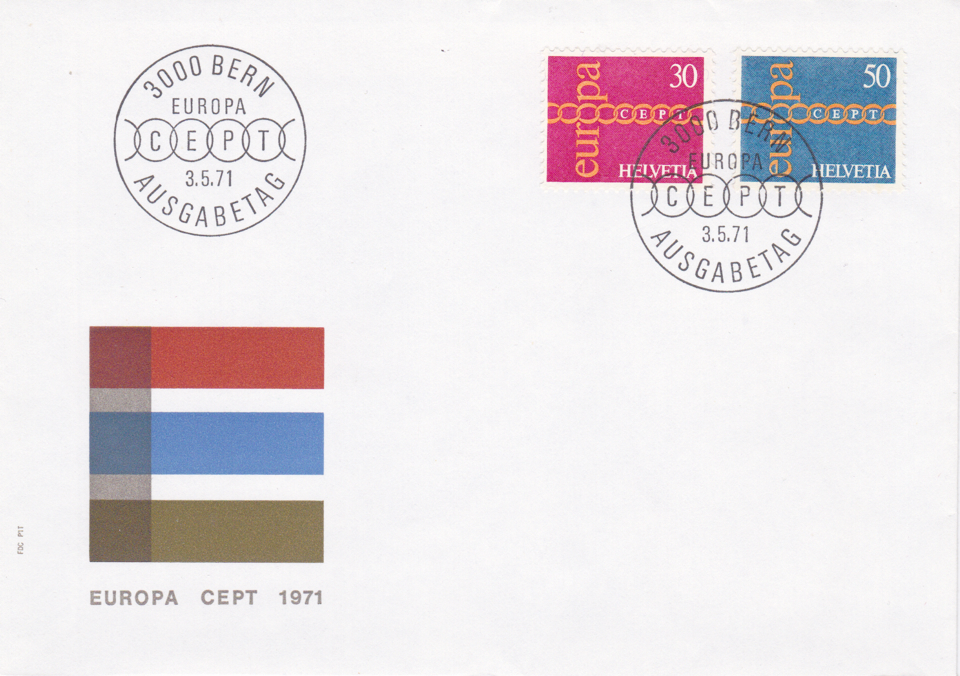 In der Schweiz erschienen die Europamarken 1971 am 3. Mai 1971. Hier die Marke zu 30 Rappen rosakarmin/gelblichorange mit dem Gemeinschaftsmotiv "Brüderlichkeit und Zusammenarbeit durch Kette symbolisiert", die in einer Auflage von 29 115 000 Stück erschien.