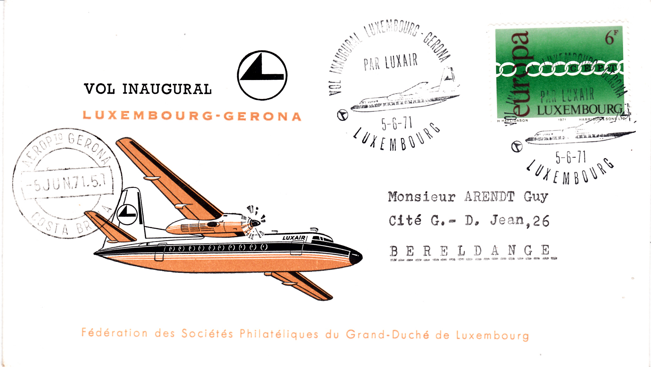Dieser Erstflugbeleg der Féderation des Sociétés Philateliqués Luxemburg wurde mit einer Europamarke zu 6 Franc frankiert und mit dem Sonderstempel zu Erstflug Luxemburg-Gerona vom 5.6.1971 gestempelt.