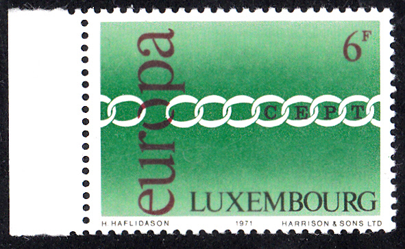 In Luxemburg erschienen die Europamarken 1971 am 3. Mai 1971. Hier die Marke zu 6 Fr mit dem Gemeinschaftsmotiv "Brüderlichkeit und Zusammenarbeit durch Kette symbolisiert ", die in einer Auflage von 1 000 000 Stück erschien.