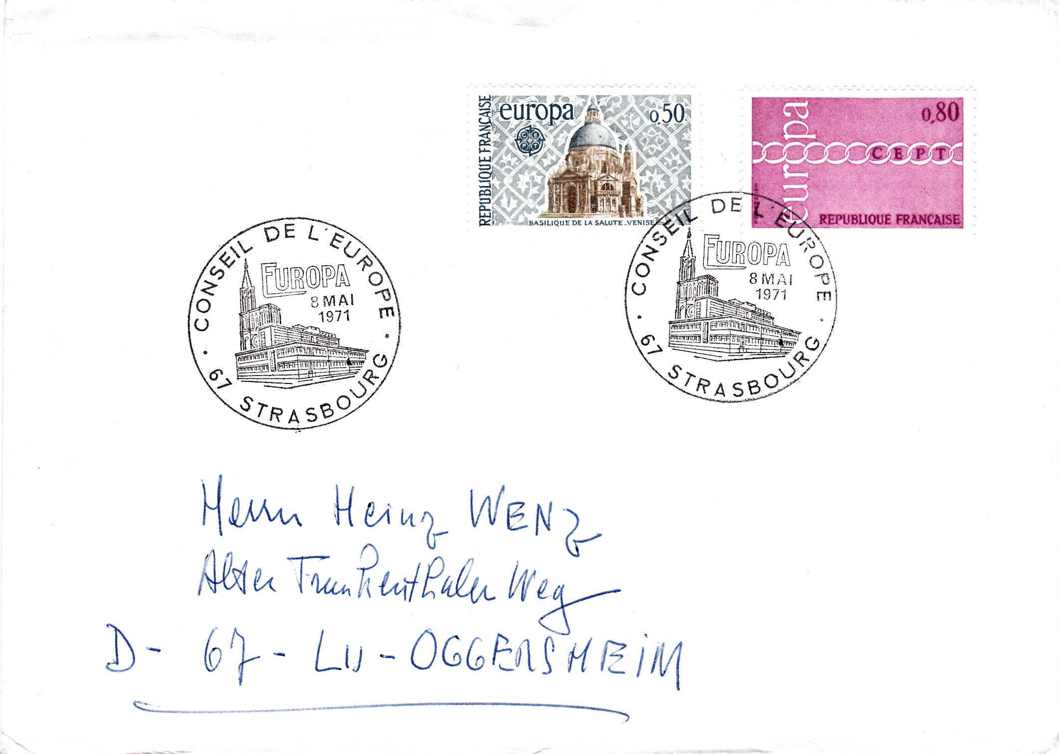 In Frankreich erschienen die Europamarken 1971 am 8. Mai 1971. Hier die Marke zu 0,50 Fr mit dem vom Gemeinschaftsmotiv abweichenden Abbildung der "Basilika „Santa Maria della Salute“ (erbaut 1631) in Venedig", die in einer Auflage von 20 000 000 Stück erschien.