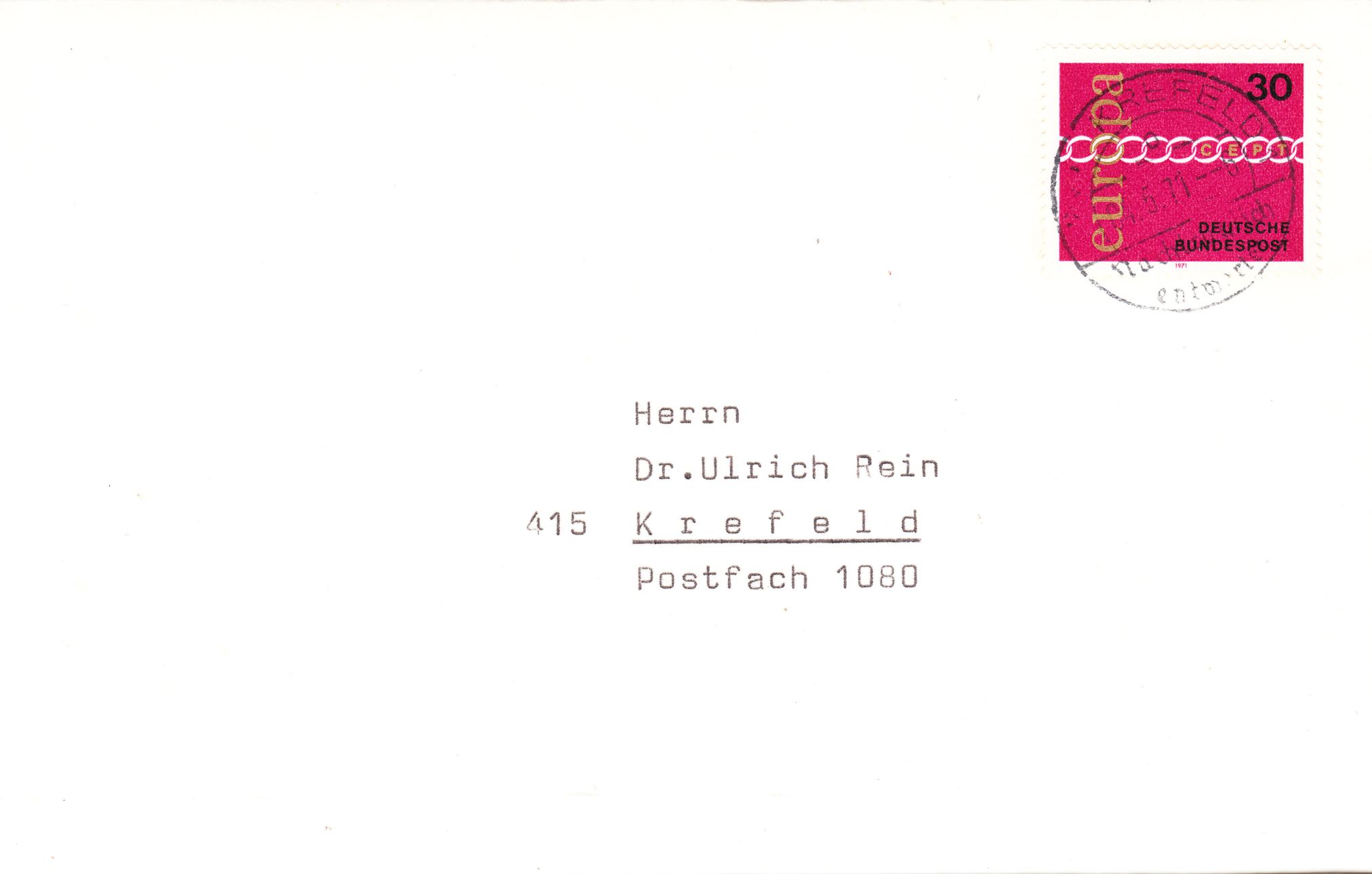 EF der Europamarke 1971 der Wertstufe zu 30 Pfennig, am 04.05.1971 in Krefeld mit uraltem Tagesstempel mit aptierter alter Postleitzahl "nachträglich entwertet":