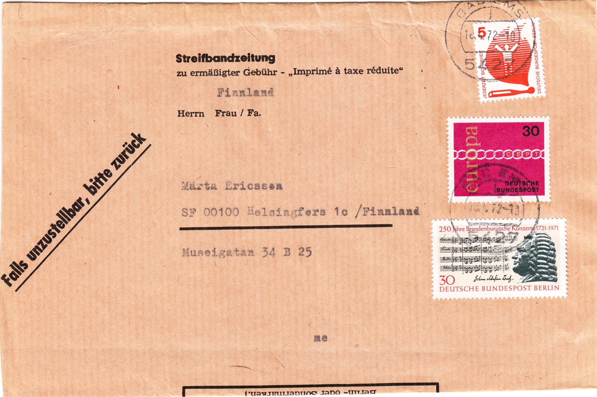 MiF auf einer selten zu findenden Sendungsart "Streifbandzeitung zu ermäßigter Gebühr = Imprimé à taxe réduite", aufgegeben am 18.04.1972 in Bad Ems, gelaufen nach Finnland: