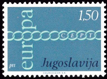 In Jugoslawien erschienen die Europamarken 1971 am 4. Mai 1971. Hier die Marke zu 1,50 Dinar mit dem Gemeinschaftsmotiv "Brüderlichkeit und Zusammenarbeit durch Kette symbolisiert ", die in einer Auflage von 946 242 Stück erschien.