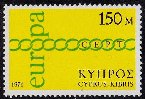 Auf Zypern erschienen die Europamarken 1971 am 3. Mai 1971. Hier die Marke zu 150 Mills mit dem Gemeinschaftsmotiv "Brüderlichkeit und Zusammenarbeit durch Kette symbolisiert ", die in einer Auflage von 468 319 Stück erschien.