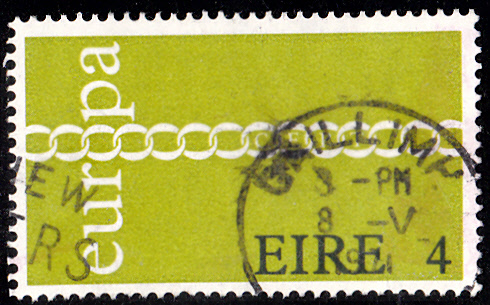 In Irland erschienen die Europamarken 1971 am 3. Mai 1971. Hier die Marke zu 4 Pence mit dem Gemeinschaftsmotiv "Brüderlichkeit und Zusammenarbeit durch Kette symbolisiert ", die in einer Auflage von 12 000 000 Stück erschien.