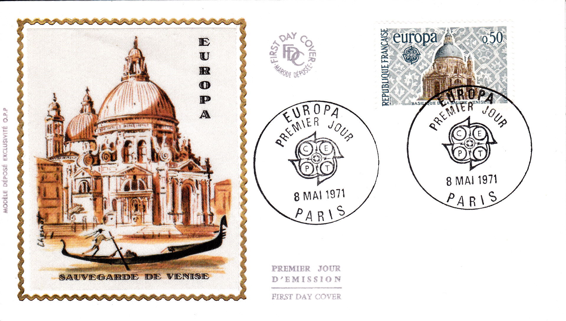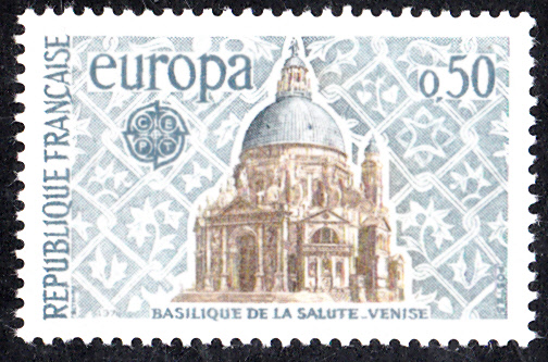 In Frankreich erschienen die Europamarken 1971 am 8. Mai 1971. Hier die Marke zu 0,50 Fr mit dem vom Gemeinschaftsmotiv abweichenden Abbildung der "Basilika „Santa Maria della Salute“ (erbaut 1631) in Venedig", die in einer Auflage von 20 000 000 Stück erschien.