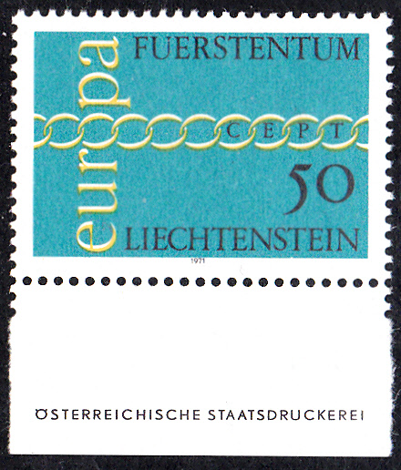In Liechtenstein erschien eine Europamarke 1971 am 11. Juni 1971. Hier die Marke zu 50 Rappen mit dem Gemeinschaftsmotiv "Brüderlichkeit und Zusammenarbeit durch Kette symbolisiert", die in einer Auflage von 1 913 447 Stück erschien.