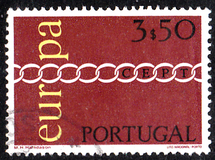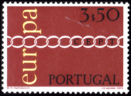 In Portugal erschienen die Europamarken 1971 am 3. Mai 1971. Hier die Marke zu 3,50 Escudo mit dem Gemeinschaftsmotiv "Brüderlichkeit und Zusammenarbeit durch Kette symbolisiert", die in einer Auflage von 5 000 000 Stück erschien.