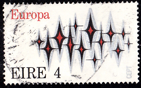In Irland erschienen die Europamarken 1972 am 1. Mai 1972. Hier die Marke zu 4 Pence mit dem Gemeinschaftsmotiv "Sterne", die in einer Auflage von 18 000 000 Stück erschien.