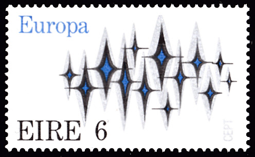 In Irland erschienen die Europamarken 1972 am 1. Mai 1972. Hier die Marke zu 6 Pence mit dem Gemeinschaftsmotiv "Sterne", die in einer Auflage von 2 000 000 Stück erschien.