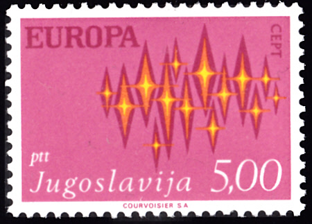 In Jugoslawien erschienen die Europamarken 1972 am 3. Mai 1972. Hier die Marke zu 5,00 Dinar mit dem Gemeinschaftsmotiv "Sterne", die in einer Auflage von 985 869 Stück erschien.