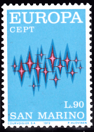 In San Marino erschienen die Europamarken 1972 am 27. April 1972. Hier die Marke zu 90 Lire mit dem Gemeinschaftsmotiv "Sterne", die in einer Auflage von 926 000 Stück erschien.