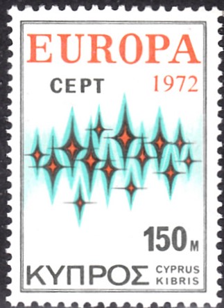 In Zypern erschienen die Europamarken 1972 am 22. Mai 1972. Hier die Marke zu 150 Mills mit dem Gemeinschaftsmotiv "Sterne", die in einer Auflage von 429 779 Stück erschien.