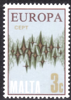 Auf Malta erschienen die Europamarken 1972 am 11. November 1972. Hier die Marke zu 3 Cent mit dem Gemeinschaftsmotiv "Sterne", die in einer Auflage von 3 017 940 Stück erschien.