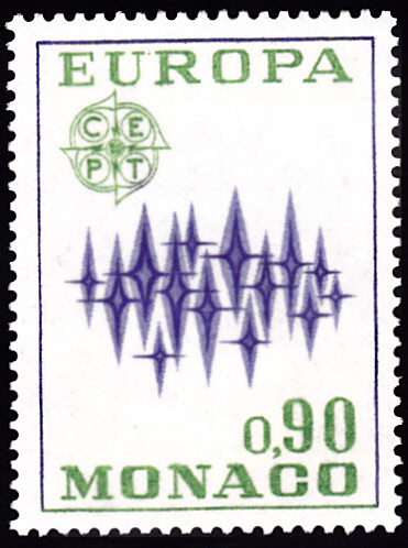 In Monaco erschienen die Europamarken 1972 am 27. April 1972. Hier die Marke zu 0,90 Franc mit dem Gemeinschaftsmotiv "Sterne", die in einer Auflage von 455 594 Stück erschien.