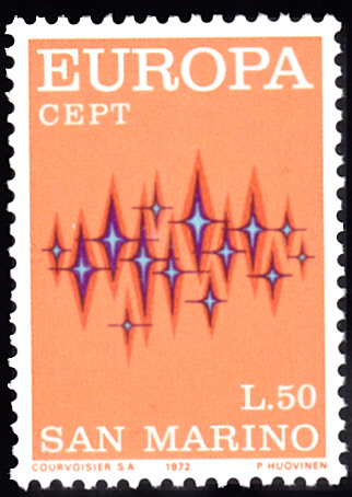 In San Marino erschienen die Europamarken 1972 am 27. April 1972. Hier die Marke zu 50 Lire mit dem Gemeinschaftsmotiv "Sterne", die in einer Auflage von 926 000 Stück erschien.