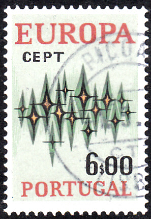 In Portugal sind die Europamarken 1972 am 1. Mai 1972 mit dem Gemeinschaftsmotiv "Sterne" erschienen. Hier der Wert zu 6,00 Escudo, der in einer Auflage von 2 000 000 Stück erschien.