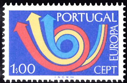 In Portugal erschienen die Europamarken 1973 am 30. April 1973. Hier die Marke zu 1,00 Escudo mit dem Gemeinschaftsmotiv "Stilisiertes Posthorn ", die in einer Auflage von 9 000 000 Stück erschien.