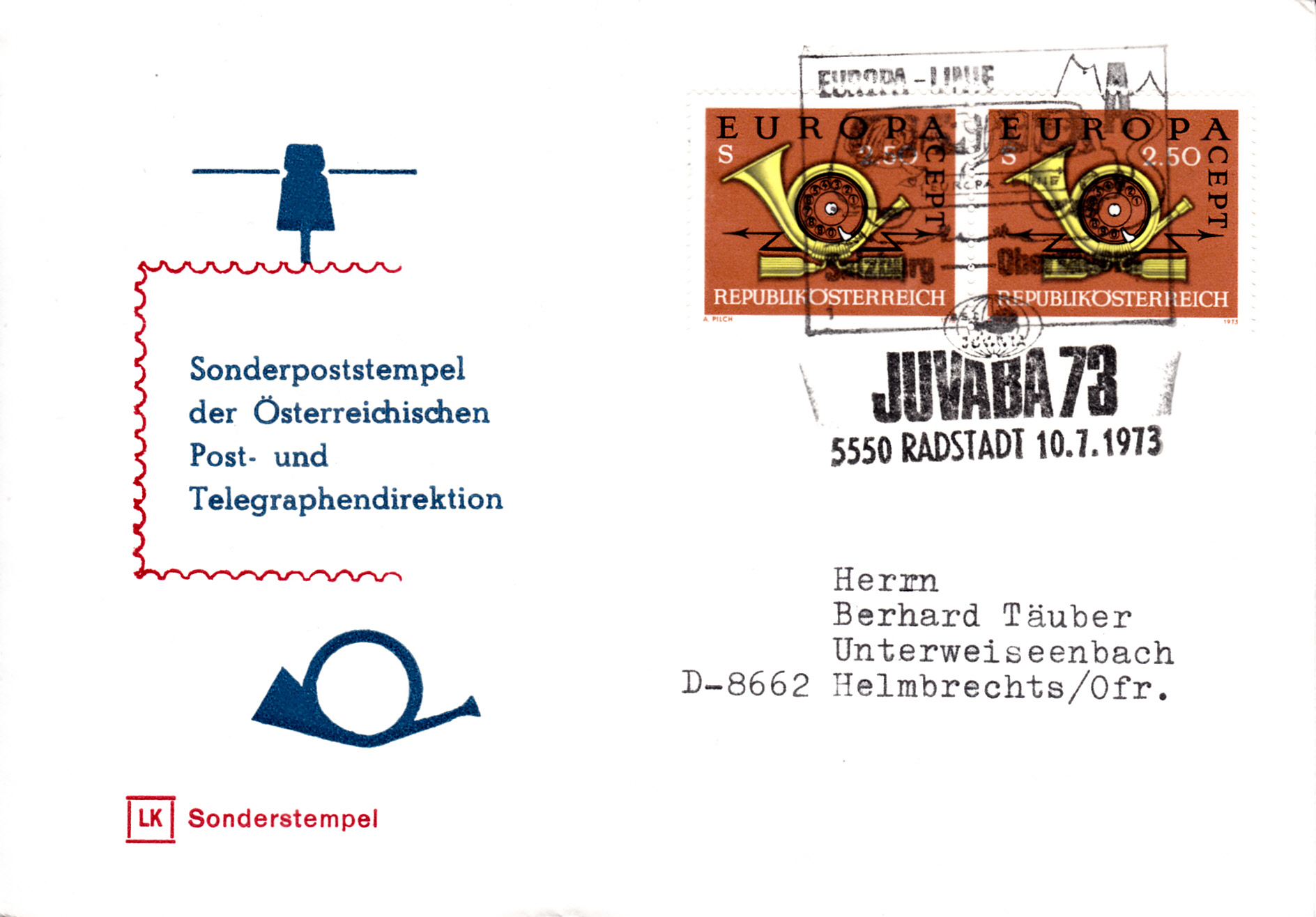 Brief mit zwei Europamarken 1973 und einen zum Thema "Europa" passenden Sonderstempel von 10.7.1973 aus Radstadt mit der Kennziffer "1".