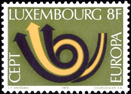 In Frankreich erschienen die Europamarken 1973 am 28. April 1973. Hier die Marke zu 8 Franc mit dem Gemeinschaftsmotiv "Stilisiertes Posthorn ". Die Auflage der Marke betrug 2 750 000 Stück.