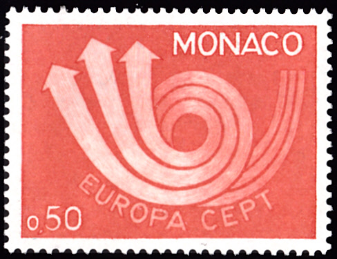 In Monaco erschienen die Europamarken 1973 am 30. April 1973. Hier die Marke zu 0,50 Franc rotorange mit dem Gemeinschaftsmotiv "Stilisiertes Posthorn ", die in einer Auflage von 587 999 Stück erschien.