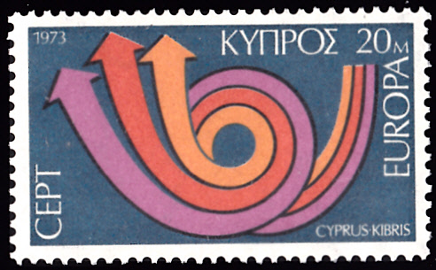 In Zypern erschienen die Europamarken 1973 am 7. Mai 1973. Hier die Marke zu 20 Mills mit dem Gemeinschaftsmotiv "Stilisiertes Posthorn ". Die Auflage der Marke betrug 724 451 Stück.