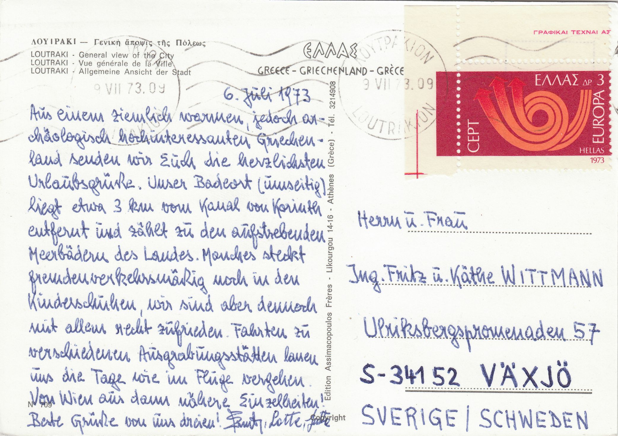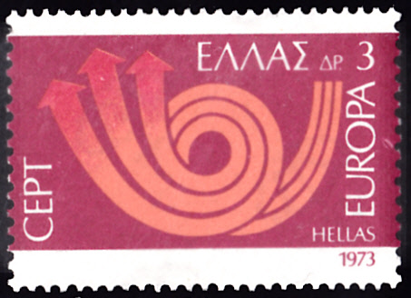 EF eines Eckrandstückes mit Bogenrandzudruck der Wertstufe zu 3 Drachmen der Europamarke 1973, Griechenland MiNr. 1148 am 09.07.1973 auf Postkarte nach Schweden: