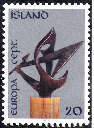 In Island erschienen die Europamarken 1974 am 29. April 1974. Hier die Marke zu 20 Kronen zu dem Gemeinschafts Thema "Skulpturen", die in einer Auflage von 1 000 000 Stück erschien. Die Marke zeigt die Bronzeskulptur "Durch die Schallmauer" von Asmundur Sveinsson (1893-1982).