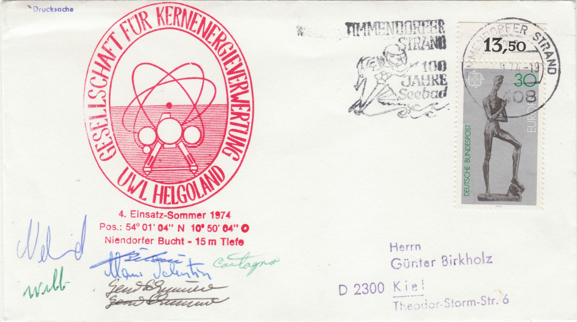 Die Entwertung erfolgte in Timmendorfer Strand, weil dieser Beleg im Unterwasserlabor = UWL HELGOLAND aufgegeben wurde, das sich im Sommer 1974 in 15 m Tiefe in der Niendorfer Bucht im Einsatz befand, was ein roter Cachetstempel dokumentiert, und das Postamt Timmendorfer Strand als nächtsgelegenes Postamt für dort aufgegebene Post zuständig war!
