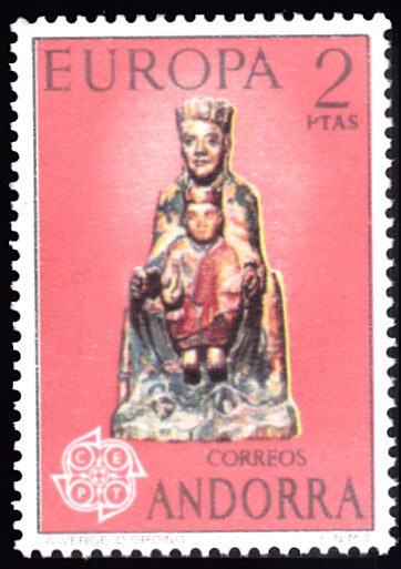 Bei der spanischen Post in Andorra erschienen die Europamarken 1974 am 29. April 1974. Hier die Marke zu 2 Pesetas zu dem Gemeinschaftsthema "Skulpturen", die in einer Auflage von 600 000 Stück erschien. Die Marke zeigt die Madonna von Ordino.
