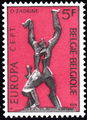 In Belgien erschienen die Europamarken 1974 am 4. Mai 1974. Hier die Marke zu 5 Franc zu dem Gemeinschaftsthema "Skulpturen", die in einer Auflage von 10 000 000 Stück erschien. Die Marke zeigt die Bronzestatue "Die zerstörte Stadt" von Ossip Zadkine (1890-1967. Maler und Bildhauer).