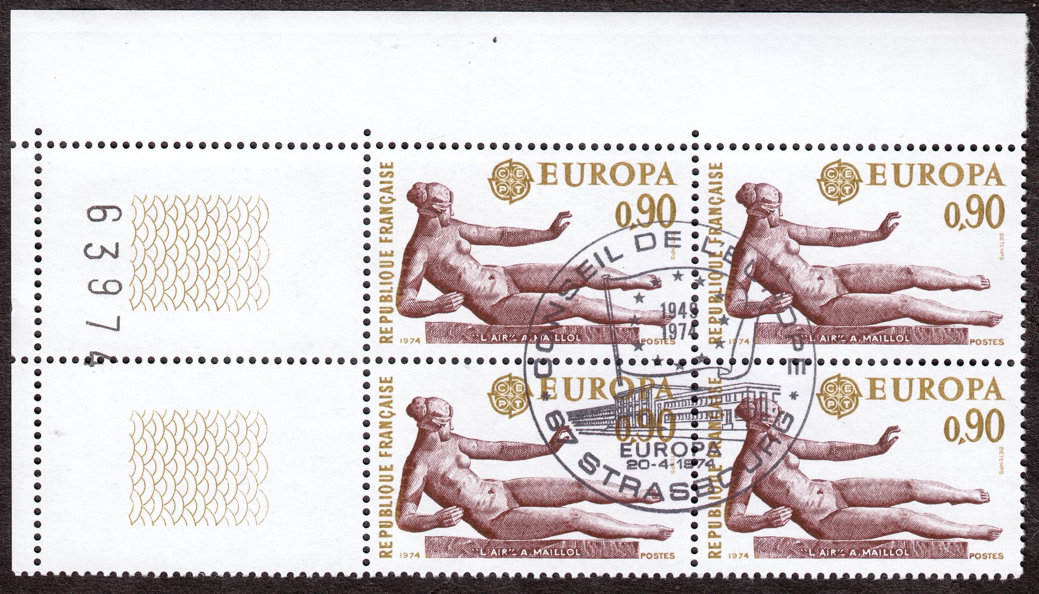 Viererblock der Europamarke 1974 der Wertstufe 0,90 aus Frankreich, MiNr. 1870, als Eckrand 1 mit bedruckten Leerfeldern und Bogenzählnummer, mit ESST: