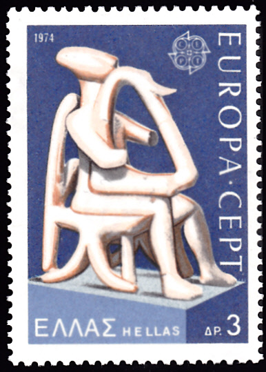 In Griechenland erschienen die Europamarken 1974 am 10. Mai 1974. Hier die Marke zu 3 Drachmen zu dem Gemeinschaftsthema "Skulpturen", die in einer Auflage von 6 000 000 Stück erschien. Die Marke zeigt die Figur eines Harfenspielers, ein aus Marmor gearbeitetes Kykladenidol (2400-2200 v. Chr.), das sich im Archäologischen Nationalmuseum Athen befindet.