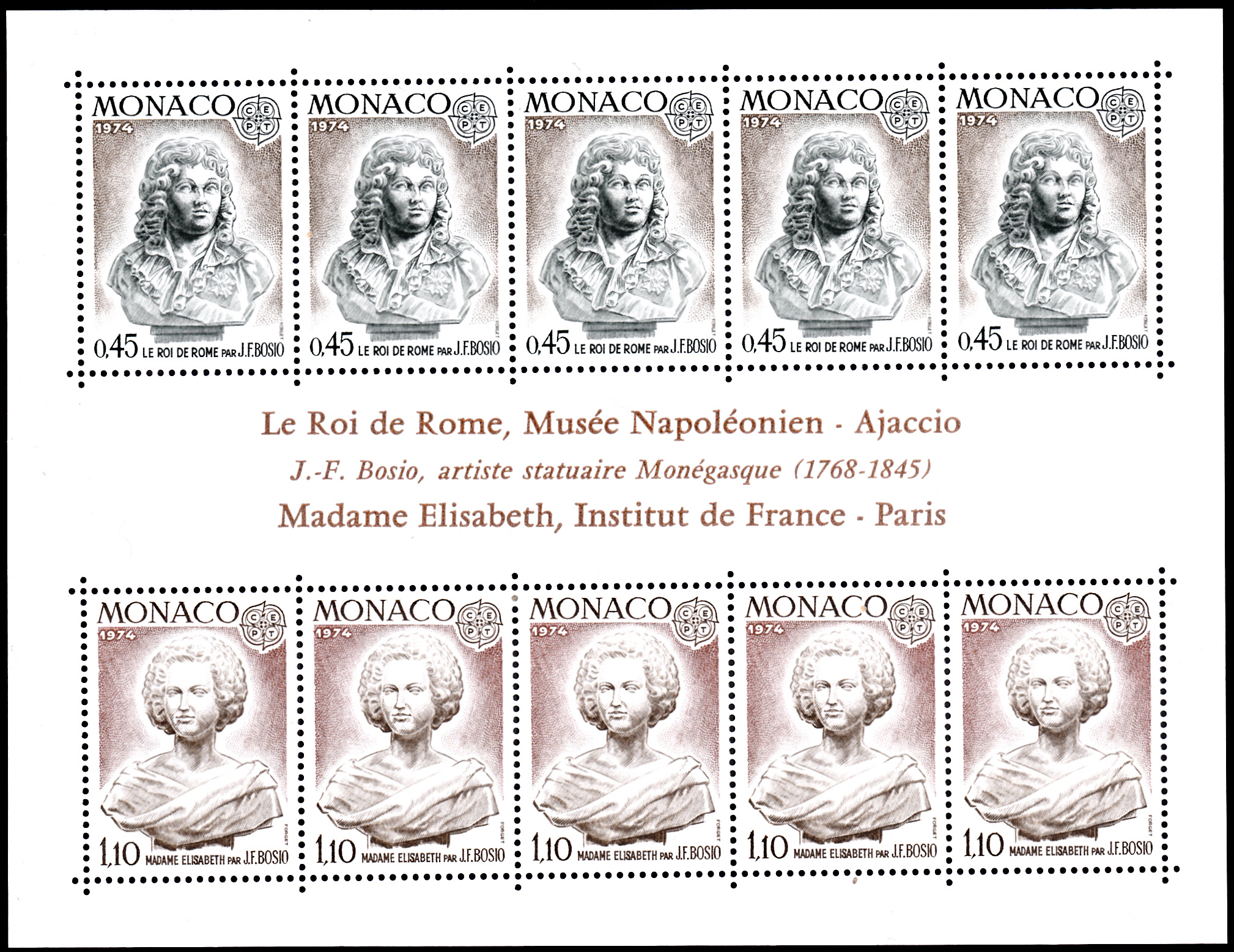 In Monaco sind die Europamarken 1974 am 8. Mai 1974 zu dem Gemeinschaftsthema "Skulpturen" mit Abbildungen von Skulpturen von François-Joseph Bosio (1768-1845, französischer Bildhauer) auch in einer Blockausgabe mit jeweils fünf Marken (MiNr 1114 und MiNr 1115) erschienen. Die Auflage betrug 258 543 Blocks.