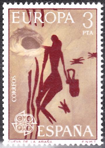 Die Europamarken 1975 zum Gemeinschaftsthema "Gemälde" erschienen in Spanien am 28. April 1975. Hier die Marke zu 3 Pta mit der "Frau bei Honiggewinnung", einer Höhlenmalerei aus La Araña. Die Auflage betrug 20 000 000 Stück.