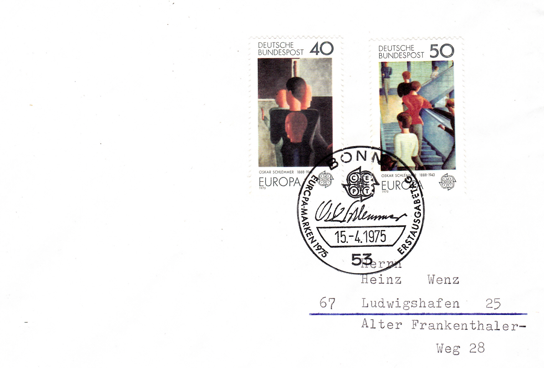 Die Europamarken 1975 zum Gemeinschaftsthema "Gemälde" erschienen bei der Deutschen Bundespost am 15. April 1975 mit. Hier die Marke zu 40 Pfennig mit dem Gemälde "Konzentrische Gruppe" von Oskar Schlemmer (1888-1943, Maler, Bildhauer und Bühnenbildner), die in einer Auflage von 50 000 000 Stück erschien.