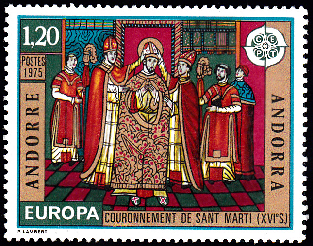 Die Europamarken 1975 zum Gemeinschaftsthema "Gemälde" erschienen bei der französischen Post in Andorra am 26. April 1975 mit Gemälden aus dem Alten Rathaus von Andorra la Vella . Hier die Marke zu 1,20 F mit der "Krönung des hl. Martin", die in einer Auflage von 500 000 Stück erschien.