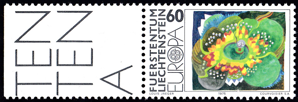 Die Europamarken 1975 zum Gemeinschaftsthema "Gemälde" erschienen in Liechtenstein am 13. März 1975. Hier die Marke zu 60 Rappen mit dem Werk "Dorf", einem Aquarell von Louis Jäger (1930-2018), die in einer Auflage von 1 805 260 Stück erschien.