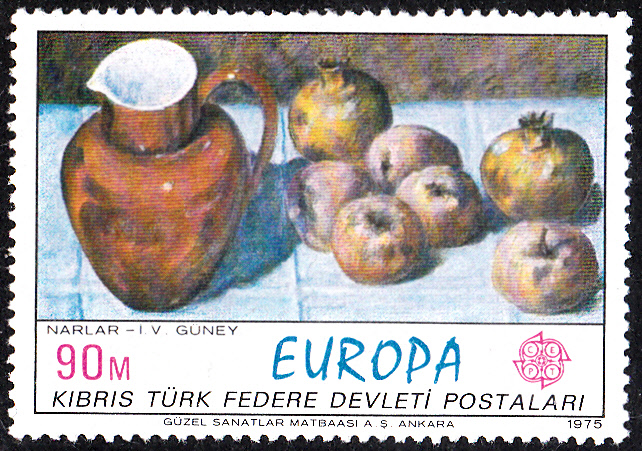 Die Europamarken 1975 zum Gemeinschaftsthema "Gemälde" erschienen in Türkisch- Zypern am 29. Dezember 1975. Hier die Marke zu 90 Mills mit dem Gemälde "Granatäpfel" von İsmet Güney (1932-2009), die in einer Auflage von 500 000 Stück erschien.